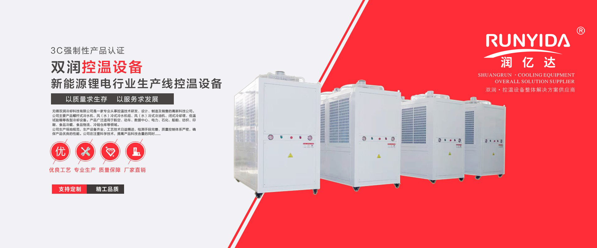 公司是一家致力于控溫技術(shù)研發(fā)、設(shè)計、制造的高新企業(yè)。公司主要產(chǎn)品包括螺桿式冷水機、磁懸浮冷水機、風(fēng)(水)冷式冷水機組、風(fēng)(水)冷式冷油機、閉式冷卻塔、低溫試驗箱等各類冷卻設(shè)備。產(chǎn)品廣泛應(yīng)用于航空、動車、數(shù)據(jù)中心、電力、石化、船舶、紡織、印刷、食品冷藏、食品物流、冷鏈倉庫等多個領(lǐng)域。